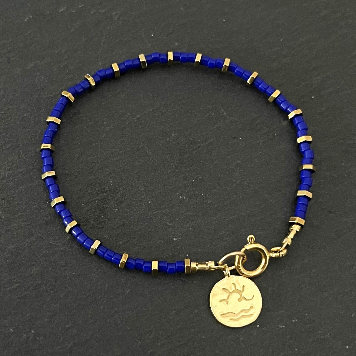 מיוצר בעבודת יד מכסף 925 בציפוי זהב מיקרוני היפואלרגני עמיד ואיכותי וחרוזים יפנים בצבע כחול.